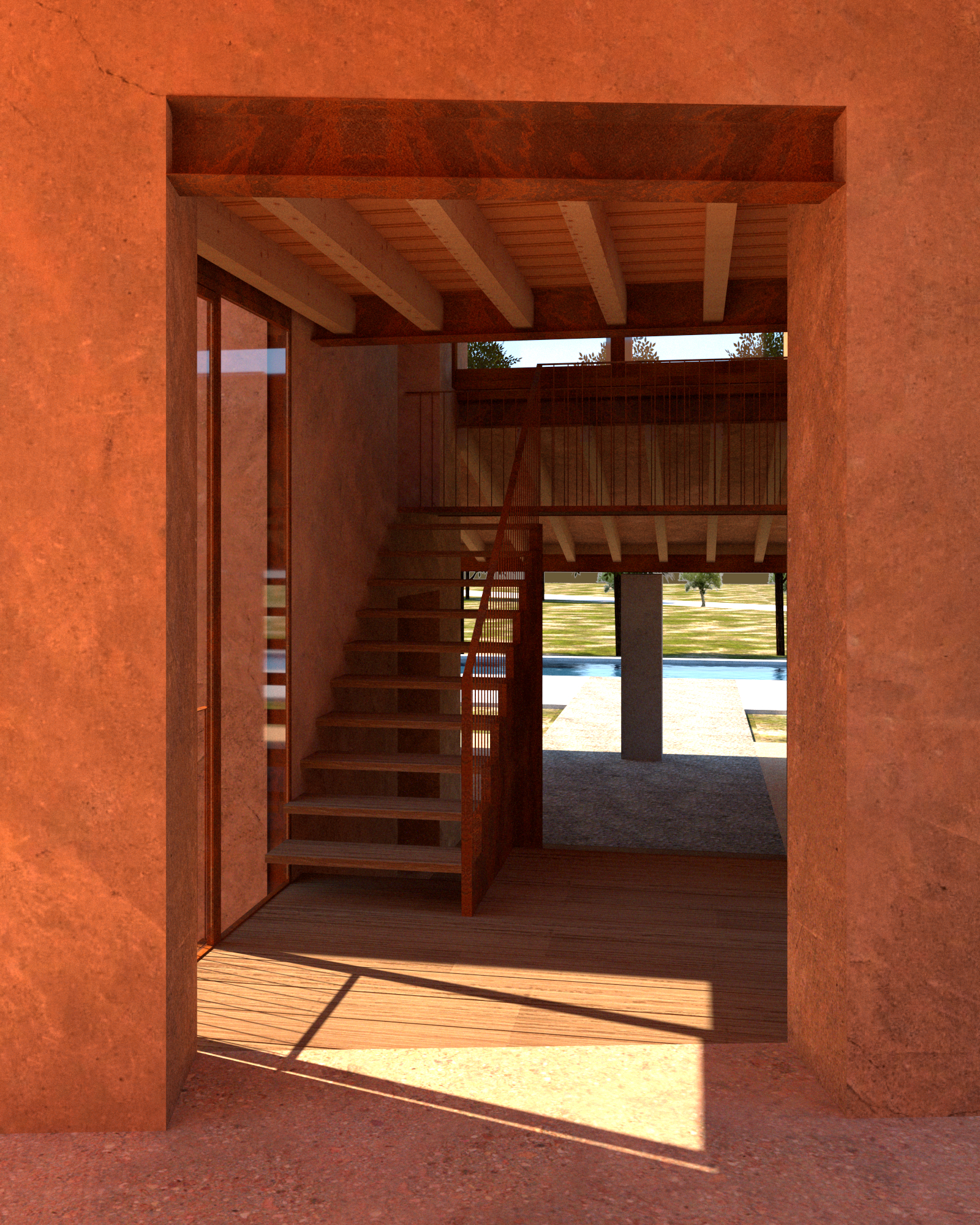 Desde el camino rural, el ingreso y sus recorridos interiores transitan los vacíos intersticiales entre los masivos volúmenes, un “desfiladero” luminoso, conectado a lo profundo y abierto hacia lo etéreo, donde escuetas huellas flotan escalonadas para favorecer recorridos y transparencias entre sus cuatro niveles interiores y el exterior.